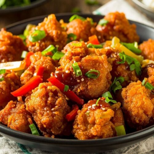 I usually make this when I’m in the mood for something savory, a little sweet, and with a kick. It’s basically crispy chicken tossed in a sticky sauce built from soy sauce, vinegar, and hoisin.
